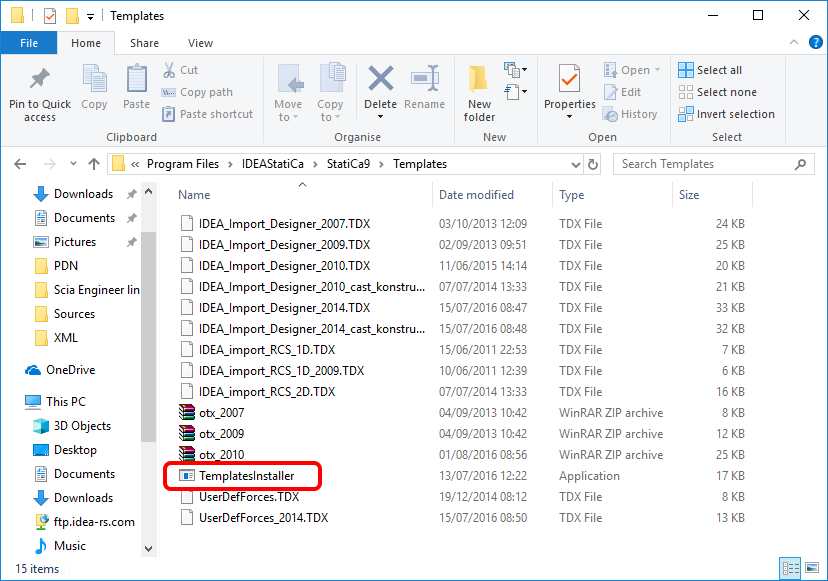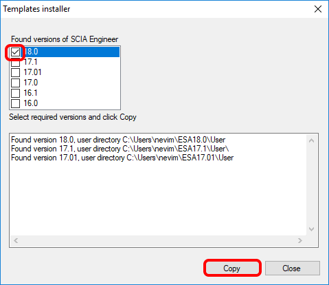 Before you import your first example, it is necessary to install the templates into Scia Engineer. To do that, you need to run TemplatesInstaller.exe usually to be found in the default installation folder of IDEA StatiCa (c:\Program Files\IDEAStatiCa\StatiCaX\Templates). There is no need to do this operation again if you do not change the SCIA Engineer version.