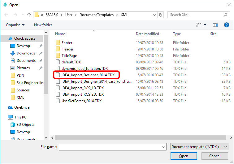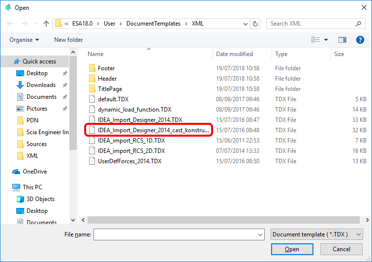 IDEA_Import_Designer_2014.TDX is a default template for the export of the whole model in Scia Engineer and is well described in the first chapters of this tutorial.