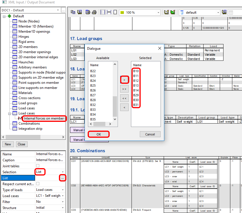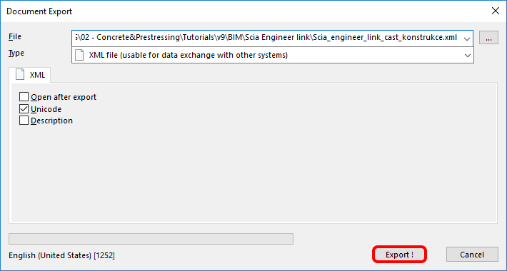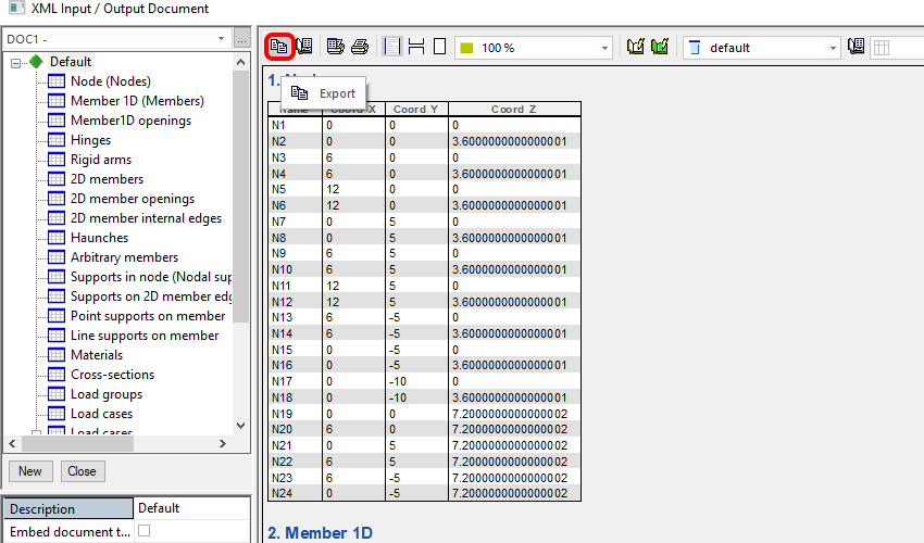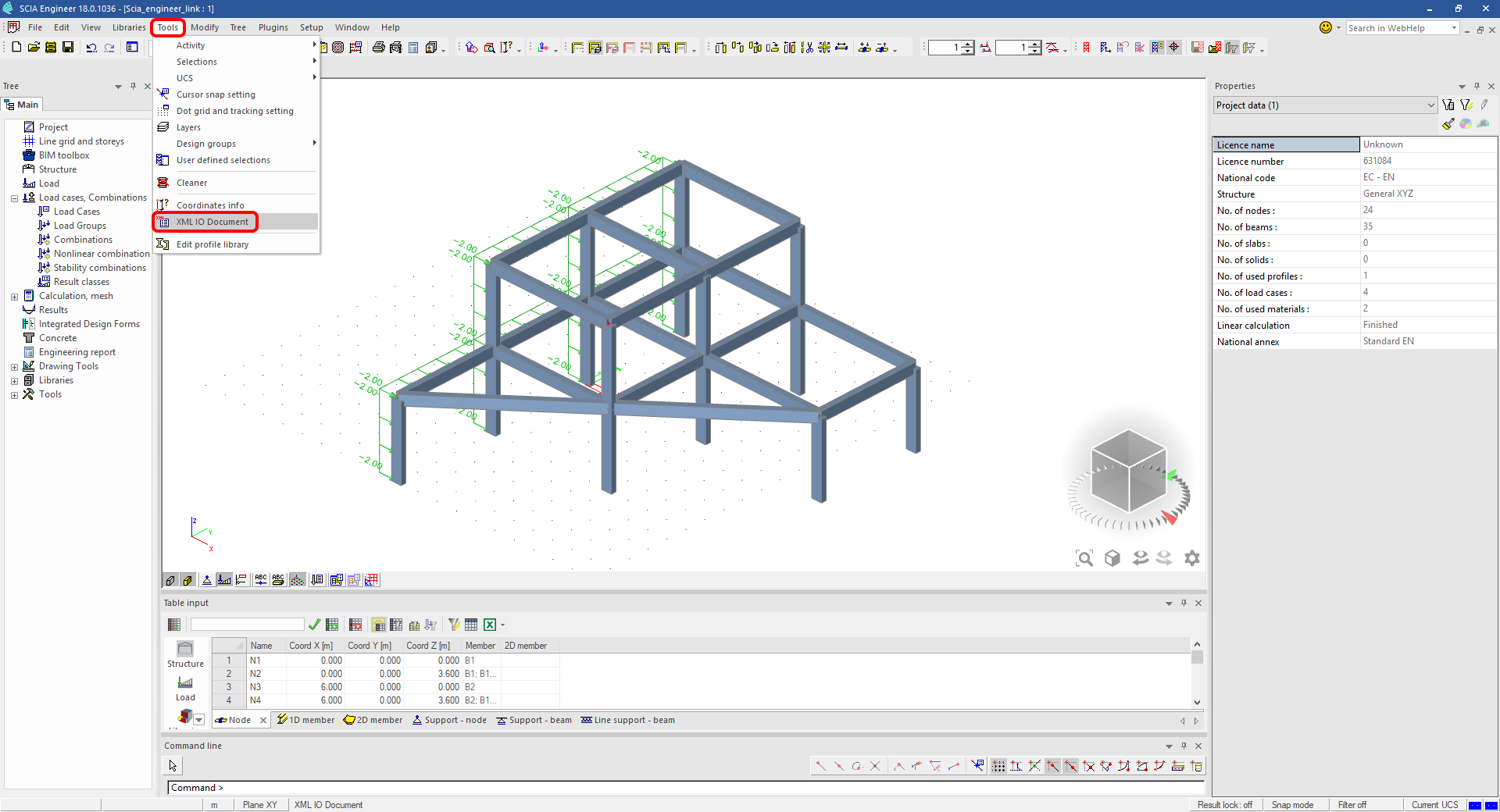 Open the model Scia_engineer_link.esa from downloaded source files, run linear analysis to obtain the results and in Tools menu select XML/IO document.